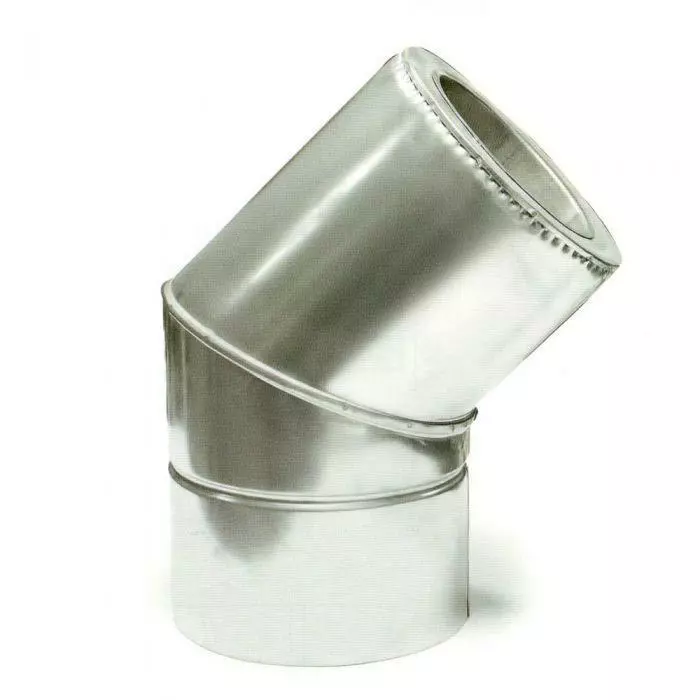 Двостінне сендвіч коліно Вент Устрій - це один з основних елементів димохідної системи, що дозволяє змінювати напрямок димової труби у випадках, коли необхідно обійти перешкоду, або повернути димохід у потрібному напрямку. Утеплений сендвіч відведення 45 ° встановлюється як на вертикальних, так і на горизонтальних ділянках димоходу, що дозволяє змонтувати конструкцію практично в будь-яких умовах.