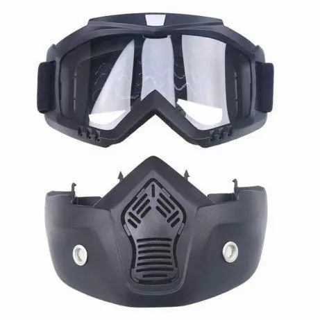 Маска-трансформер може використовуватись безпосередньо як захисна маска і може трансформуватися як захисні окуляри. Окуляри виготовлені з пластику, що гнеться не б'ється!! Прекрасний рівень циркуляції повітря та антифоговий ефект забезпечує перфорована підкладка у внутрішній частині окулярів. Можна використовувати окремо окуляри, можна кріпити до них нижній захист та використовувати як захисну маску на обличчя.